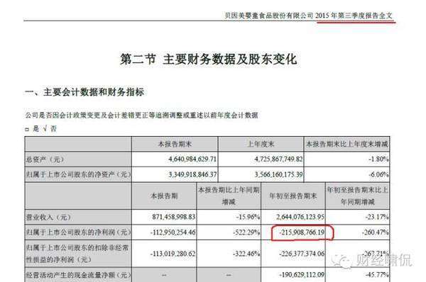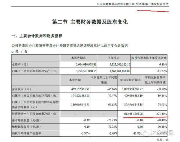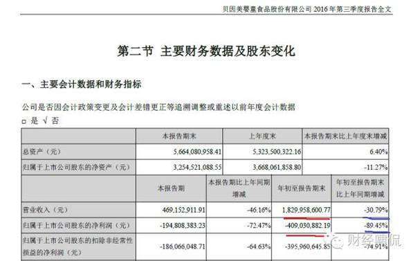 10月29日,貝因美(002570.SZ)在深交所遞交了2016年第三季度報告,營業(yè)收入約為18.3億元,和2015年同期約為26.44億元相比,下滑30.79%;歸屬于上市公司股東的凈利潤約為-4.09億元,同比跌幅高達(dá)89.45%,收入、盈利雙雙下滑。