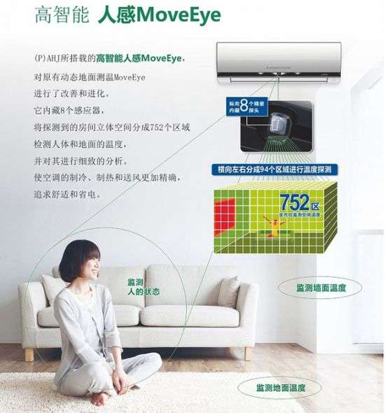 (黑色)MSZ-PAHJ12VA搭載的高智能人感MoveEye對原有的動態(tài)地面測溫系統(tǒng)進行了改善和優(yōu)化,它內(nèi)藏8個感應(yīng)器,將探測到的房間環(huán)境分成752個區(qū)域,監(jiān)測人體和地面溫度,并對其進行細(xì)致的分析,即時進行氣流控制,有效解決生活空間溫度不均勻、冷暖差異等問題,相對于沒有MoveEye的普通空調(diào)產(chǎn)品節(jié)能30%。