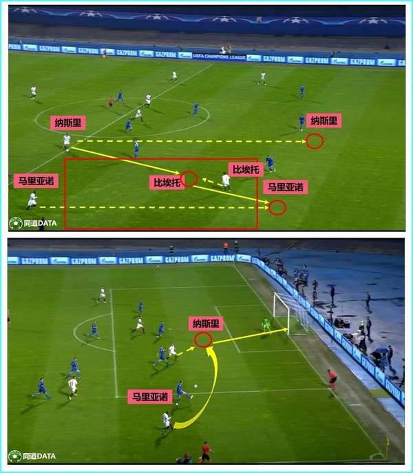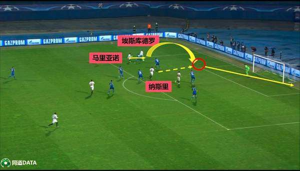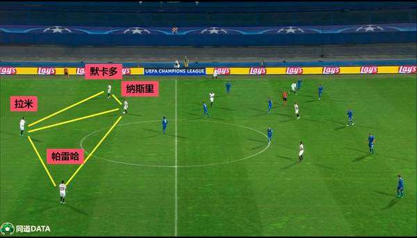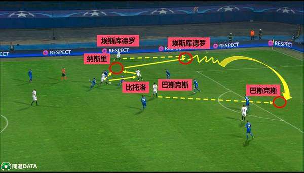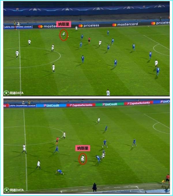 以上圖為例,在薩格勒布迪納摩三名防守隊(duì)員的圍搶下,閑庭信步的將球帶出包圍圈,與比托洛做二過(guò)一撞墻配合后,將球分給左路套邊插上的埃斯庫(kù)德羅,得球后的西班牙人將球傳至中路,巴斯克斯完成頭球攻門(mén)。威脅進(jìn)攻的源頭正是源于納斯里出色的腳下技術(shù)和靈活的拉邊跑位。