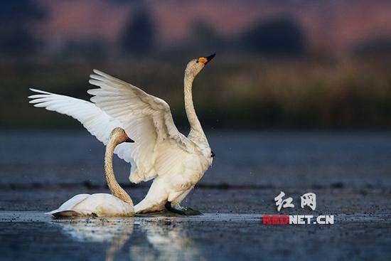 紅網(wǎng)長沙11月7日訊(時刻新聞記者 胡芳)近幾日,長沙松雅湖來了一群“白富美”——小天鵝,于是,松雅湖有了“天鵝湖”之稱。其實,長沙不止一個“天鵝湖”,望城大澤湖早在2009年就發(fā)現(xiàn)了小天鵝“三口之家”;2010年,在沙河附近,有攝友拍到了一群小天鵝,一行23只。這些小天鵝在水上覓食、棲息,它們時而展翅滑翔,輕盈踏水;時而引頸常鳴,呼朋引伴,甚是熱鬧。