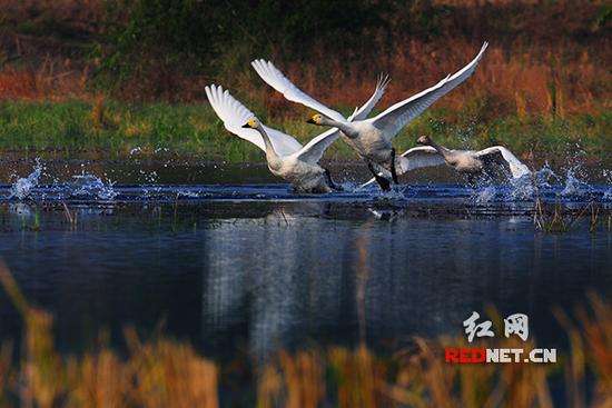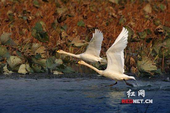 望城大澤湖,兩只天鵝從湖面飛起來的時候,姿態(tài)優(yōu)雅。長沙市野生動植物保護協(xié)會供圖