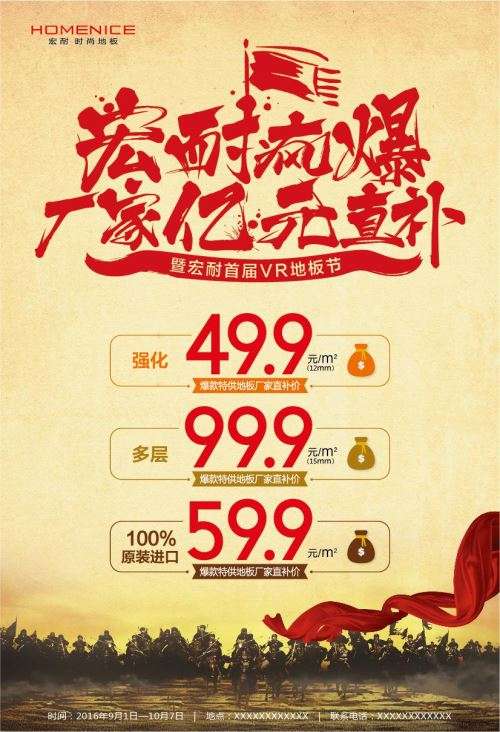 2016年9月1日至10月7日,來(lái)到全國(guó)范圍內(nèi)宏耐專賣店,可以親自體驗(yàn)VR虛擬現(xiàn)實(shí)技術(shù)帶給你的不一樣的購(gòu)物體驗(yàn)!同時(shí),這段時(shí)間來(lái)進(jìn)店就送同款5平米客廳地板,進(jìn)口地板更可再享同一安裝地址其他面積在原價(jià)基礎(chǔ)上再享6.8折優(yōu)惠。
