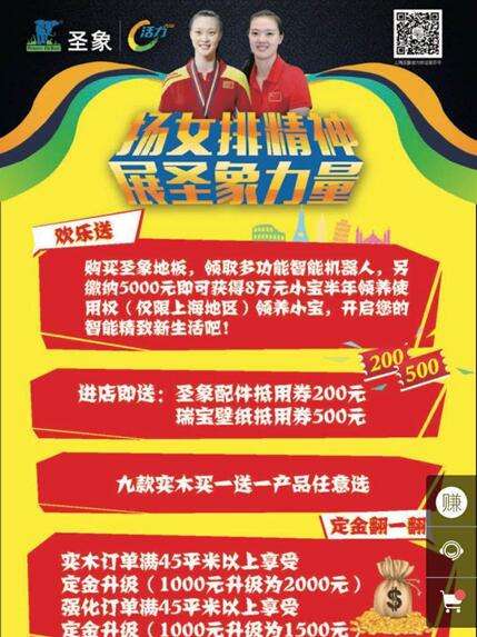 上海的消費(fèi)者更是期待多多,圣象創(chuàng)始人翁少斌將作為上海公司重量級(jí)嘉賓與消費(fèi)者面對(duì)面,現(xiàn)場(chǎng)為21位幸運(yùn)消費(fèi)者送出金條大獎(jiǎng),同時(shí)優(yōu)惠豪禮不斷,購(gòu)地板領(lǐng)多功能機(jī)器人,繳納5000元現(xiàn)金還能獲得價(jià)值8萬元的小寶半年領(lǐng)養(yǎng)使用權(quán)。此外,還有配件、壁紙抵用券,定金升級(jí),買一送一實(shí)木產(chǎn)品任選等多重讓利優(yōu)惠,為你在這個(gè)冬天打造完美家居生活,助力家居品質(zhì)升級(jí)。 值得一提的是,為了讓消費(fèi)者買得更開心,圣象地板還邀請(qǐng)了顧家家居、奧普吊頂、朗斯淋浴房、蘇寧易購(gòu)聯(lián)動(dòng)讓利,居家所需,一站搞定!