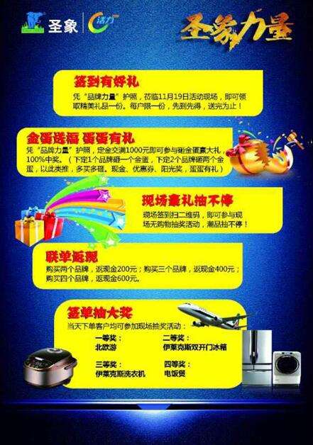 此次活動(dòng),圣象將推出“品牌力量”護(hù)照,消費(fèi)者憑此簽到可領(lǐng)取精美禮品,交訂單滿1000的還可參與100%中獎(jiǎng)的砸金蛋,更有多個(gè)品牌聯(lián)單返現(xiàn)活動(dòng)。即使無購(gòu)物也可參與現(xiàn)場(chǎng)抽獎(jiǎng),贏北歐游、伊萊克斯雙開門冰箱等豪華大獎(jiǎng)。