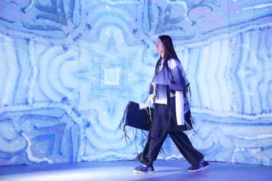 “穿在身上的藝術(shù)時尚史”時空藝術(shù)多媒體秀延續(xù)著令年輕人振奮的時尚主題。男模們在舞臺上一字排開,炫目的3D激光燈束在白色布衣上不斷變換圖案,投射出繽紛前衛(wèi)的迷幻影像,恰如不斷更換的時髦新裝。這自然是一場關(guān)于科技與時尚的絕妙跨界!