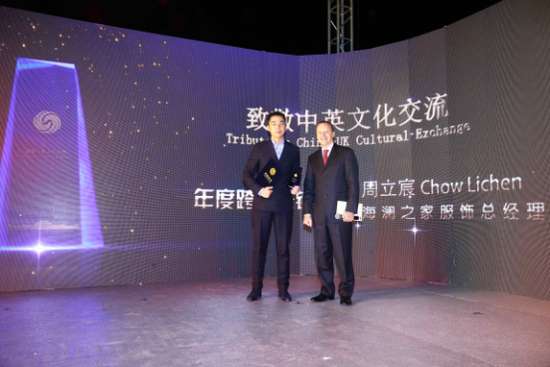 英國大使館駐華大使羅廷先生為海瀾之家服飾總經(jīng)理周立宸頒發(fā)“跨界先鋒獎”