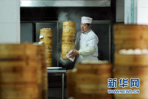 4月21日,沈陽(yáng)老邊餃子館中街店的員工端出蒸好的餃子。新華社發(fā)(李雨澤 攝)