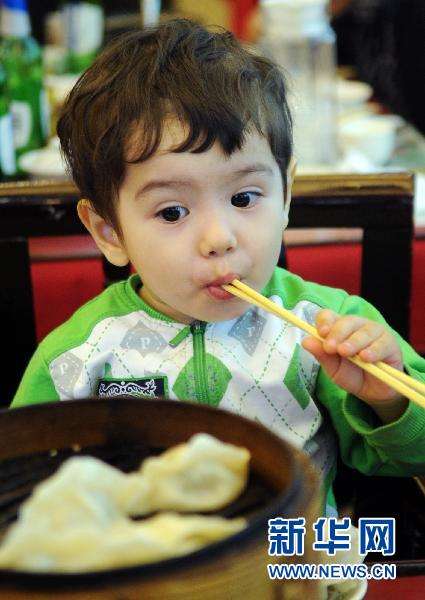 4月21日,外國(guó)小朋友被沈陽(yáng)老邊餃子館中街店的美食吸引。新華社發(fā)(李雨澤 攝)