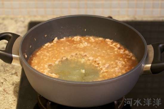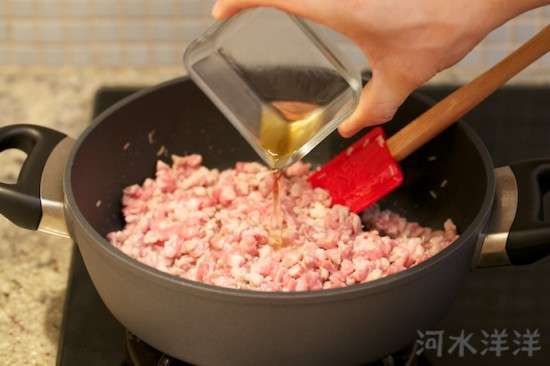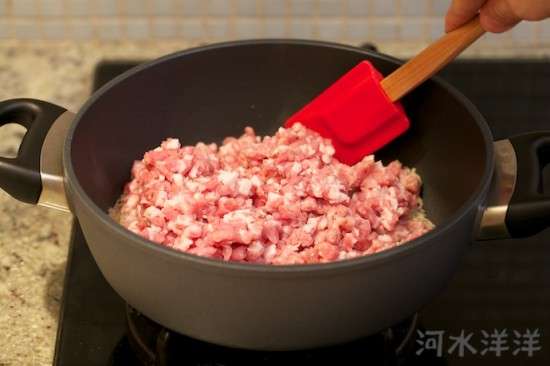 把切好的肉餡(其實(shí)就是肉丁)倒入鍋內(nèi),