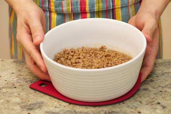 等到鍋?zhàn)永锏囊后w慢慢變少,不能全部淹沒肉丁的時(shí)候,停止加熱,把肉丁轉(zhuǎn)移到一個(gè)碗里面,把大碗放在冷水里面幫助餡料冷卻,然后蓋上保鮮膜放進(jìn)冰箱內(nèi)備用。這里還有一個(gè)小插曲,煨好肉餡之后,LG用小調(diào)羹盛了一些放進(jìn)嘴巴里面嘗了一下,嘗完之后,咕噥出一句“要死掉了!”,我一聽,嚇壞了,以為一鍋肉餡要報(bào)廢了,趕緊追問“怎么了?怎么了?”,沒想到這位老兄說,“好吃得要死掉了”。