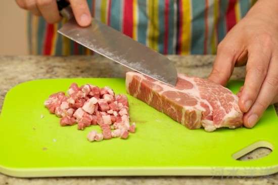 第一步是準(zhǔn)備餃子的餡料。要想包子餃子好吃,就必須自己動(dòng)手切肉餡。我們這里用的是肥瘦相間的豬梅頭肉,先用刀切成厚片,然后切成粗絲,最后切成0.5厘米見方的小丁。切這種肥瘦相間的鮮肉最為困難,所以刀一定要磨得快快的,省力一點(diǎn)的辦法就是把肉先放在冰箱冷凍室內(nèi)凍上3個(gè)小時(shí)會好切一些,另外還可以用400克瘦肉和100克肥肉分別切丁后再搭配起來。