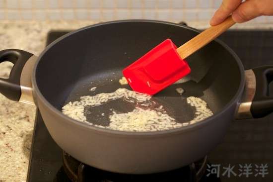 翻炒幾下后倒入10克料酒、20克老抽醬油和20克面醬,翻炒均勻。