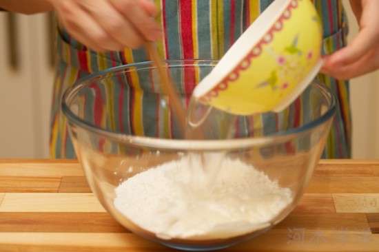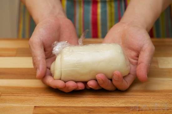 把面粉、水和豬油的混合物倒在案板上和成面團(tuán),然后將面團(tuán)揉透(也就是外觀均勻、光滑而且有彈性,大致需要15分鐘時(shí)間),包上保鮮膜松弛20分鐘。
