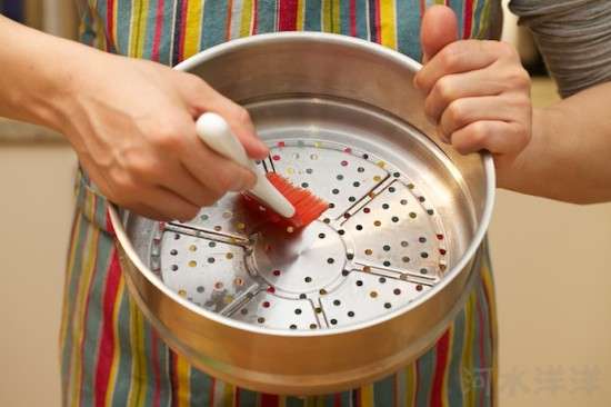 第三步,等待面團(tuán)松弛的時(shí)間我們完成一些其它工序,首先在金屬籠屜內(nèi)部刷上一層花生油,防止蒸餃子的時(shí)候發(fā)生粘連。