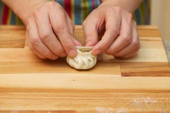 在餃子皮中央放上適量餡料,并整成大致長圓形。包餃子的手法多種多樣,據(jù)說單單是邊家第三代傳人邊霖發(fā)明的餃子就有一百多種,不但餡料豐富多彩,外觀也是多種多樣。這里演示的是一種常見的包法,首先把餃子皮周邊大部分(大3/4)捏上褶子,然后把剩余部分與褶子部分捏合。