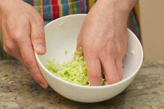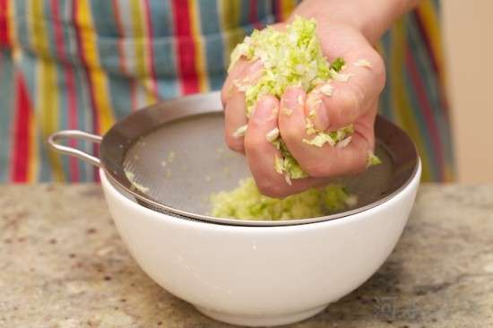 然后把白菜葉放入濾籃中,用流水沖洗片刻,去除多余鹽分,然后用手攥干水分備用。