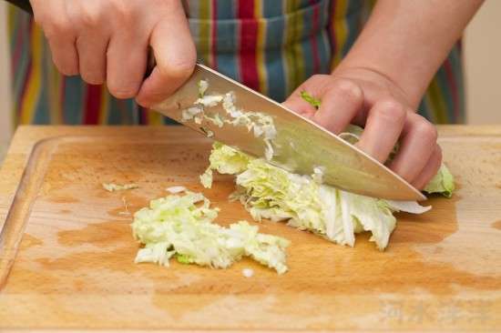 餃子餡里面還要配些蔬菜,這里我們用的是大白菜和青蔥。取白菜中間部位(不要最外層的老葉子,也不要內(nèi)層的白菜心)菜葉4-5片,切去白菜幫子部分(這部分可以燒個(gè)醋溜白菜什么的,千萬別扔掉),剩下的葉子部分應(yīng)該在100克左右,洗凈后先切絲再切段,然后切成末。