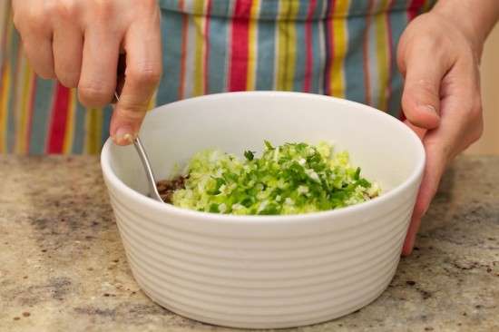 把前面準(zhǔn)備好的白菜末和青蔥末加進(jìn)煨好的肉餡里面,攪拌均勻。再加上10克花生油和5克芝麻油,攪拌均勻,這個(gè)時(shí)候可以嘗一下餡料(肉餡已經(jīng)煨熟,是可以直接吃的),如有必要再加適量的鹽,調(diào)味到自己喜歡的程度。洋洋可以保證,你嘗了這個(gè)餡料之后,肯定信心大增,因?yàn)樗奈兜烙谩坝捎馈眮硇稳菀埠敛贿^分。