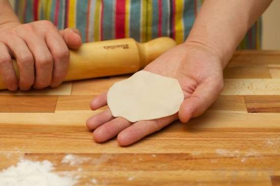 每次取一個(gè)劑子,搟成中間稍厚邊緣稍薄直徑9厘米左右的餃子皮,