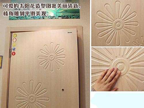 它的造型整體偏向板式室內(nèi)門的感覺,表面紋理簡(jiǎn)潔明朗,飾面為淺色,清新大方,表面圖案為可愛單純的太陽花造型,讓人看了心情舒暢起來,小編想,或許就是這種積極的圖案設(shè)計(jì)吸引了多數(shù)人的心吧!用手摸花型的棱角邊緣,感覺雕刻平滑圓潤(rùn),專業(yè)美觀。