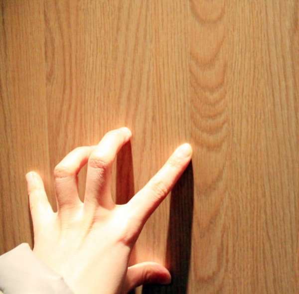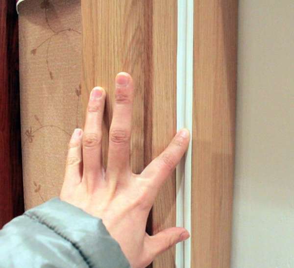 細(xì)節(jié)展示:近看門板上的紋理變化豐富美觀,遠(yuǎn)看形成條狀與平行裝飾線形成分割效果。N817實(shí)木復(fù)合門采用的防塵條(隔音條)為白色,材質(zhì)像是塑膠類的,和淺色效果的門臉也很搭襯。