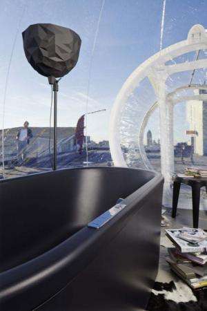 這是一個透明獨立的繭狀氣泡,里面包含衛(wèi)浴間中的基礎設備。開放式的私密空間中,充滿令人向往的愜意生活氣息。