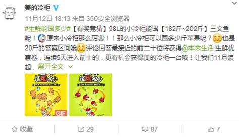 日至14日期間,美的冷柜每天在官方微博開(kāi)展#生鮮能囤多少#線上競(jìng)猜活動(dòng),每天答案最接近的前二十位用戶可獲得本來(lái)生活網(wǎng)生鮮優(yōu)惠卷,而連續(xù)5天進(jìn)入前十的用戶,更有機(jī)會(huì)獲得美的冷柜一臺(tái)。有趣的抽獎(jiǎng)和問(wèn)題,引發(fā)了網(wǎng)友積極討論,“98L的美的冰柜到底可以囤多少