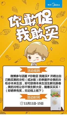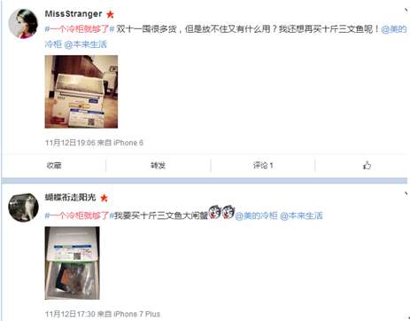 同時(shí),對(duì)于購(gòu)買美的冰柜的用戶,回饋力度更給力。11月11日至15日期間,用戶可以同時(shí)在美的冷柜和本來(lái)生活網(wǎng)微博上參與#你敢促 我敢買#活動(dòng),用戶曬出購(gòu)買冷柜的單據(jù),可以獲得高額本來(lái)生活網(wǎng)促銷卷以及美的冷柜抽獎(jiǎng)機(jī)會(huì)。優(yōu)惠力度更大,獲獎(jiǎng)幾率更高,許多用戶表示找不到單據(jù)好著急啊。