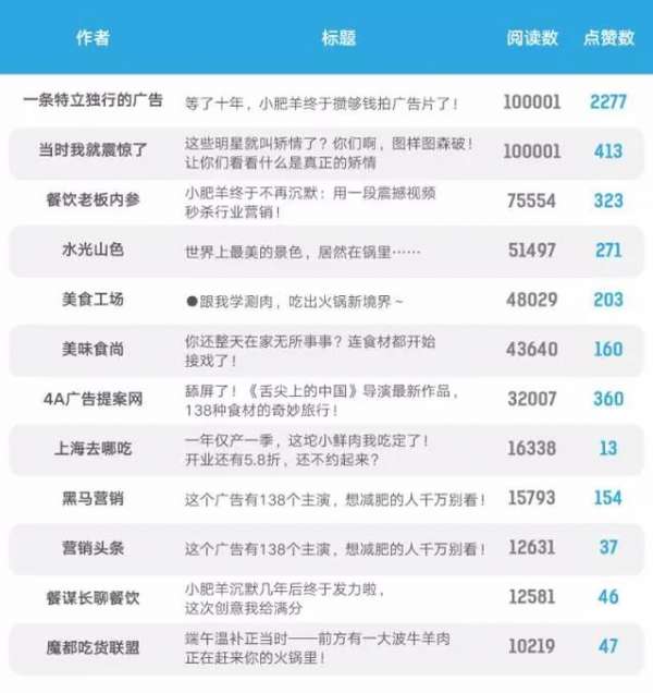 除此之外,“餐飲老板內(nèi)參”“毒舌電影”“V電影”“當(dāng)時(shí)我就震驚了”等大號(hào)都相繼發(fā)布了相關(guān)的推薦文章。以“小肥羊+舌尖上的中國”為關(guān)鍵詞在新榜后臺(tái)搜索,發(fā)現(xiàn)一個(gè)月內(nèi)共有55篇相關(guān)文章,其中閱讀數(shù)超過1萬的有12篇。
