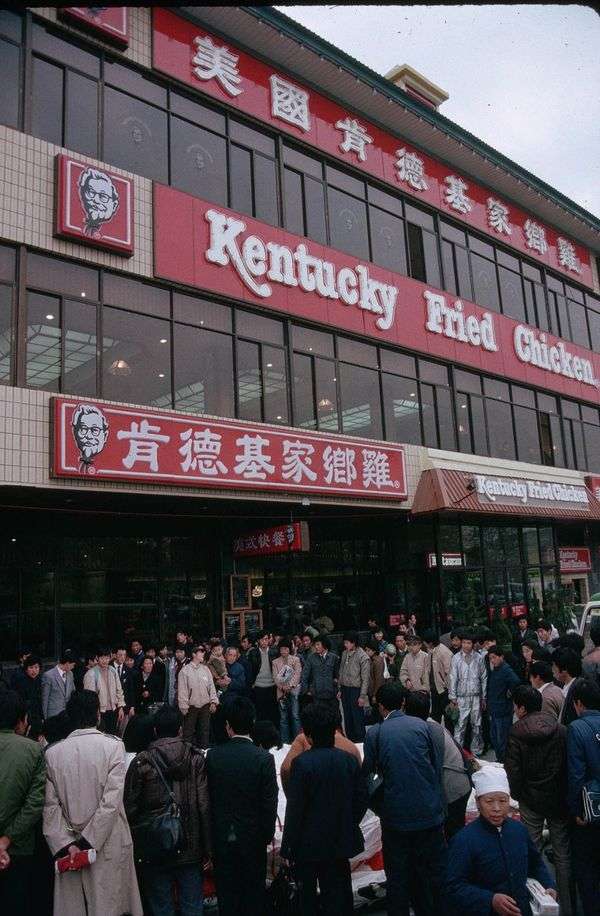 1987年,一群人在圍觀中國(guó)第一家肯德基炸雞餐廳的開(kāi)店儀式