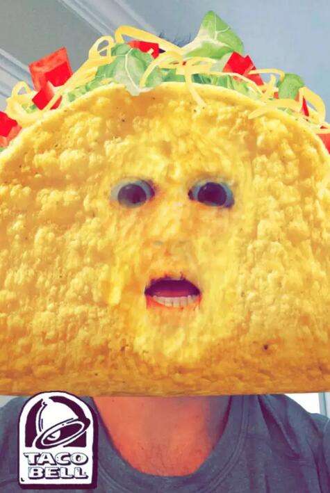 這也是為什么他們可以有足夠的預判力和執行力,早在2013年5月就進駐日后爆紅的圖像制作分享軟件Snapchat。Taco Bell 指派了兩個二十多歲的年輕人,一周三次專職為其制作原創內容,從最開始的圖片試水,到最后越玩越放松,短視頻、表情包、電子賀卡、濾鏡、實時在線游戲全上,畢竟這里沒有字數和形式的限制,讓他們和粉絲的交流更加深入。以傳播最成功的 taco 濾鏡為例,用戶上傳人像,它就會把頭變成一只魔性的 taco ,就這個傻里傻氣的東西,竟然錄得了2億多次的互動……