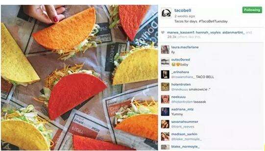 社交網絡運營的關鍵,是品牌的擬人化。這個“人”不是一個宣傳喇叭,而是另一個品牌的粉絲。所以 Taco Bell 在社交網絡上的不少圖片,畫質也只能說是正常清晰,濾鏡用的可能還不如粉絲多,有的直接在照片上印一行大字就發出來了(照片還可能是其他粉絲拍了直接借來用的)。