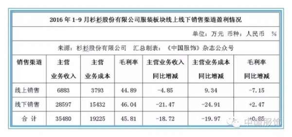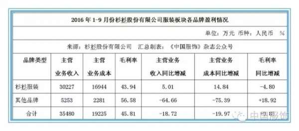 業(yè)內(nèi)人士向《中國服飾》雜志記者表示,杉杉股份服裝業(yè)務(wù)自2012年以來一直處于調(diào)整期,盈利狀況尚需底部反轉(zhuǎn)。隨著杉杉不斷調(diào)整服裝業(yè)務(wù),預(yù)計未來其服裝業(yè)務(wù)盈利狀況有望得到一定的改善。《中國服飾》雜志記者獲得的數(shù)據(jù)則顯示,2016年1-9月,寧波杉杉股份有限公司服裝板塊門店主營業(yè)務(wù)收入為24,074萬元,占公司主營業(yè)務(wù)收入總額的比重為7.15%,