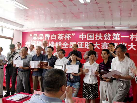 杯”中國扶貧第一村赤溪全國征聯(lián)大賽已落幕。中華詩詞學(xué)會顧問、廈門大學(xué)蔡厚示教授、福建省文學(xué)藝術(shù)聯(lián)合會副主席、中國美協(xié)理事陳濟(jì)謀、閩東日報總編輯王紹據(jù)、福鼎磻溪鎮(zhèn)鎮(zhèn)長葉禮瑞、品品香茶業(yè)邵克平總經(jīng)理等出席楹聯(lián)樓群全國征聯(lián)大賽頒獎儀式。