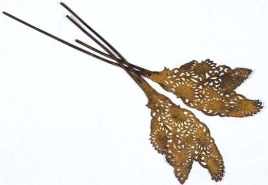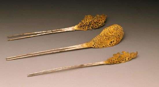 唐代開始流行使用金銀打造首飾,劇照中,武如意所戴的是金釵雕花朵形,被稱為釵朵。每一對釵朵都是一式兩件,結構相同而圖形相反,可以左右對稱插戴,這種金銀釵以鏤花圖案最為多見。