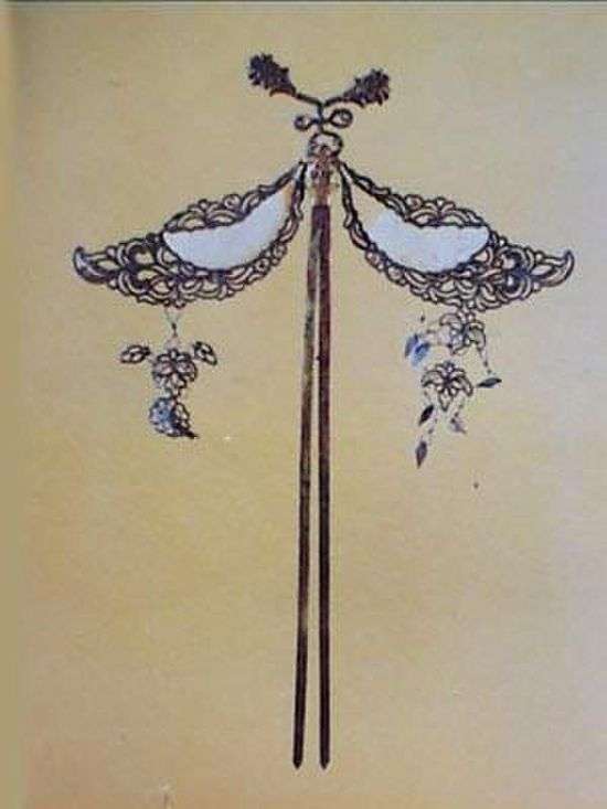 發(fā)飾還有步搖、簪、翠翹等。步搖屬于簪的一類,一般形式多為鳳凰、蝴蝶等,或綴有流蘇或是珠串,女子走路時,金飾會隨著擺動,栩栩如生,故名取其行步則動搖,唐朝非常流行。