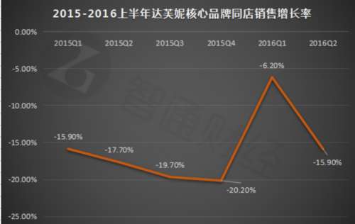 即便如此,達(dá)芙妮同店銷售業(yè)績?nèi)栽谙禄W?015年起,達(dá)芙妮核心品牌的同店銷售業(yè)績的同比降幅就在不斷擴(kuò)大。2016年第二季度,其核心品牌同店銷售業(yè)績同比下降15.9%。