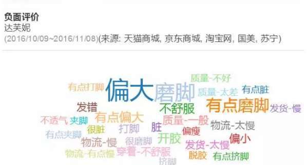 ,主要負(fù)面評(píng)價(jià)是在產(chǎn)品和物流方面,偏大,磨腳,開(kāi)膠,物流慢都成為用戶的吐槽點(diǎn),說(shuō)明