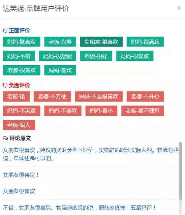 在性別分布上,達(dá)芙妮的男女比例各占50%,對(duì)于一個(gè)女鞋品牌來(lái)講,這樣的性別比例是很難得見(jiàn)到的。根據(jù)用戶對(duì)品牌的評(píng)價(jià)可以看到,造成這種情況的主要原因是很多男士買來(lái)送給另一半或者媽媽,說(shuō)明