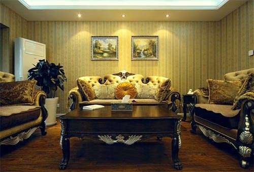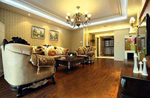 :客廳靜謐、紅鱗流彩,墻紙、洞石、實(shí)木家私裝扮華貴而大氣,沙發(fā)、茶幾、電視柜和燈具的選擇都考慮了風(fēng)格一致,在典雅中透出淡淡的奢華。