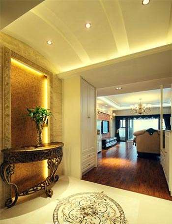 玄關(guān)富貴盈門(mén),這里原是內(nèi)窗,經(jīng)過(guò)改裝設(shè)計(jì)成玄關(guān),正面采用金花米黃云石加砂巖造型走邊,墻面用金色墻紙,地面選了成品地磚拼花,頂部做了拱形處理,彰顯貴氣。