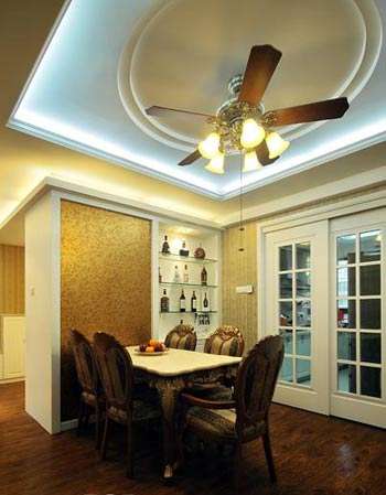 :客廳入餐廳開(kāi)口太小,采用吊扇燈,既能調(diào)節(jié)空調(diào)效果,同時(shí)契合設(shè)計(jì)風(fēng)格。酒柜的背面就是入戶的玄關(guān),旁邊原來(lái)結(jié)構(gòu)是混凝土墻,無(wú)法改動(dòng),就勢(shì)做了個(gè)多功能柜,旁邊空間做成酒柜,最大程度利用空間。