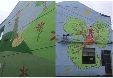 彩繪l學(xué)校外墻上象征著“希望與愛”的小王子墻畫