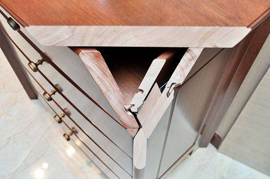 圖為左側(cè)柜門推開后重疊于右側(cè)柜門前方,推拉非常順暢。柜門厚度采用了25mm板材,圓弧形的設(shè)計(jì)磨去了棱角,使原本笨拙的形象變得憨厚可掬,非常考驗(yàn)工藝。