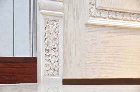 英式古堡風(fēng)格的花卉雕塑堪稱一絕,亂中有序,爭(zhēng)奇斗艷,每一朵花形態(tài)各異,充滿生命力,這本身就可以被贊譽(yù)為手工藝品。這款實(shí)木門的雕花并不是很大,貴在小而精,遍布木門的各個(gè)角落,原材料樹木的生命力在藝術(shù)家的手中綻放光彩。