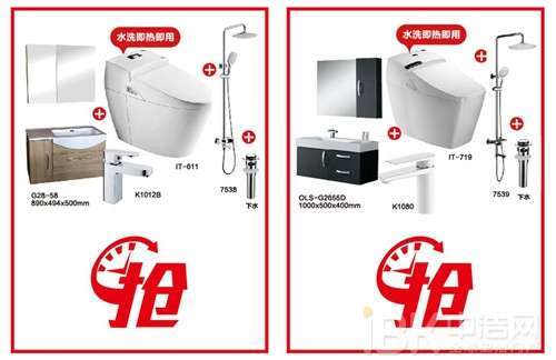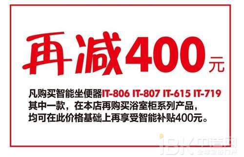 活動(dòng)期間,購(gòu)歐路莎智能馬桶IT-806JD、IT-807JD、IT-615、IT-719其中的任意一款,且在同一家專賣店聯(lián)單購(gòu)浴室柜系列產(chǎn)品,即可在此價(jià)格基礎(chǔ)上立享智能補(bǔ)貼優(yōu)惠400元,一站式購(gòu)齊更省錢、省心!