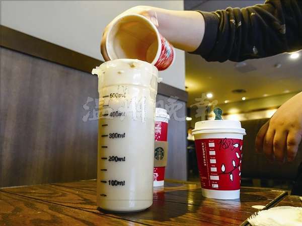 為了測(cè)試記者所購(gòu)買的咖啡是否達(dá)到標(biāo)注數(shù)量,記者將這些咖啡按所購(gòu)店分批倒入帶有刻度的樂扣杯進(jìn)行測(cè)量(實(shí)驗(yàn)過程中,盡可能倒盡杯中奶泡)。結(jié)果顯示,每種杯型里的實(shí)際咖啡量與官方標(biāo)注的數(shù)量或多或少存在偏差。其中,相差最大的一杯,比官方標(biāo)注數(shù)量少了45ml。