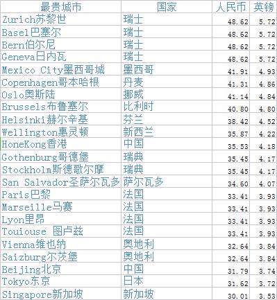 這兩個(gè)中國(guó)城市也納入了調(diào)查范圍。香港一杯星巴克咖啡的價(jià)格為35.53元(4.18英鎊),排名全球第8位;北京的價(jià)格為32元(3.74英鎊),排名全球第13位(注,價(jià)格相同的城市并列,比如并列第一的是4座瑞士城市)。
