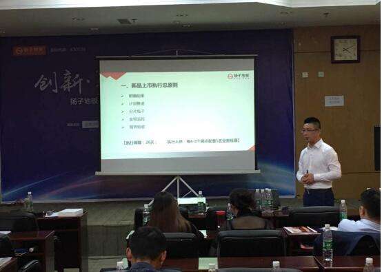 揚(yáng)子地板總部營(yíng)銷中心銷售總監(jiān)、銷售管理部部長(zhǎng)何林先生做《2017年新產(chǎn)品上市執(zhí)行落地方案》的主題演講。