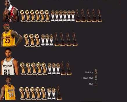 自古勝敗論英雄,成者英雄敗者蔻,若論總冠軍和FMVP,喬丹6座總冠軍+6座總決賽MVP+5座常規賽MVP排第一,鄧肯5座總冠軍+3座總決賽MVP+2座常規賽MVP,科比5座總冠軍+2座總決賽MVP+1座常規賽MVP第三,詹姆斯3座總冠軍+3座總決賽MVP+4座常規賽MVP第四。